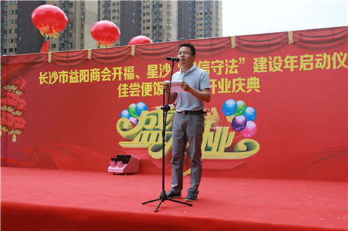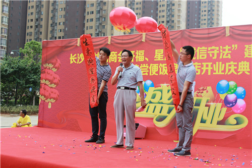 锣鼓喧天,鞭爆齐鸣。2015年5月21日上午,我会开福、星沙“守法诚信”建设年启动仪式暨佳尝便饭泉塘店开业庆典顺利举行。湖南省人事厅原副厅长黄寿德,省劳动厅原副厅长郭铁民,省发改委以公代赈处原主任龚铁华,省供销社副食品公司原总经理龚荣抗,国防科大渡河系政委蔡建勋,原国防科大处长李均初,长沙市益阳商会会长吴长云,常务副会长龚剑非,副会长蔡上清、梅可,副秘书长崔平华,中国知名品牌协会湖南分会常务副会长苏文,长沙市五金商会会长高玉堂,副会长姜朝五、夏艳辉、叶国志、张锦霞,秘书长肖莉,安化经促会长沙分会会长李蒲初等领导参加了本次活动。龚剑非担任本次活动主持。 (图为活动现场)